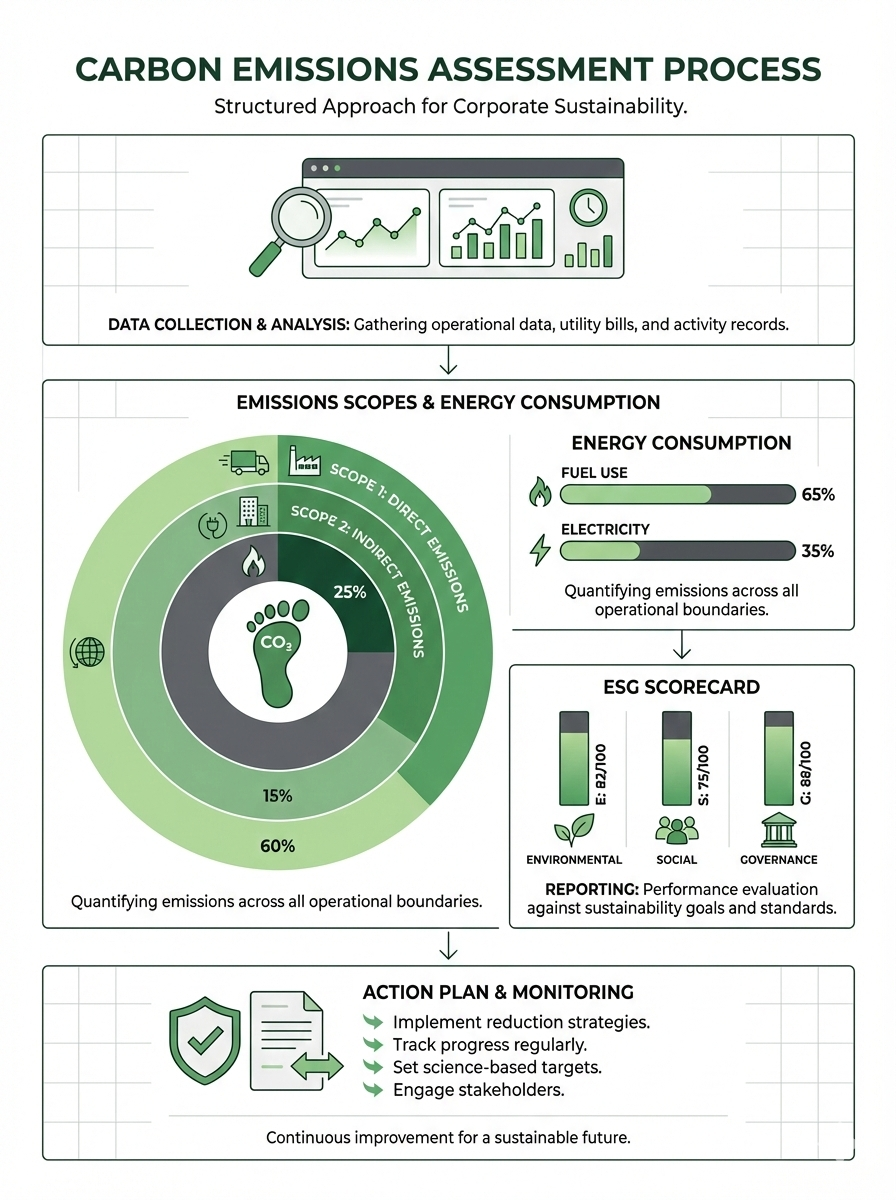We evaluate your carbon footprint, ESG governance maturity, climate risks, regulatory exposure, supply chain resilience, and stakeholder expectations. These insights help us uncover immediate opportunities and define a practical pathway for long-term sustainability.