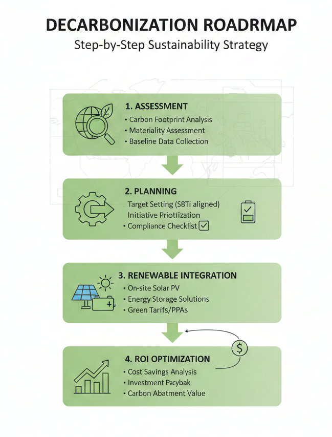 Based on the assessment, we design a comprehensive sustainability roadmap. This includes ESG strategy alignment, energy transition planning, climate risk mitigation, sustainable supply chain integration, stakeholder engagement strategy, and green finance structuring. Every element is tied to business KPIs and stakeholder value creation.